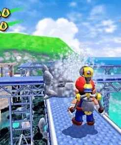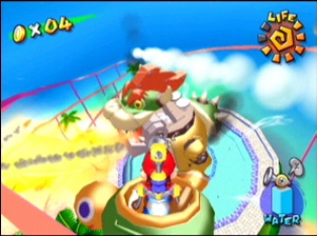 Pero ninguna aventura de Mario estaría completa sin una sorprendente innovación, y en Super Mario Sunshine, se trata de esa curiosa bomba llena de agua sujeta a la espalda corpulenta del fontanero. Por otro lado, este dispositivo impulsado por agua es el medio de Mario para lavar el desastroso lodazal que el falso Mario ha creado, y su spray poderoso va acompañado de algunos de los efectos acuáticos más sofisticados que jamás se han visto. Pero la mochila también se puede utilizar para lanzarse por los cielos cristalinos de la isla, ayudar a Mario a dar un salto mortal mientras se cuelga de las cuerdas, lanzar a nuestro amigo del mono azul a través de estanques desde una plataforma de lirios… y realizar una multitud de funciones secretas todavía por desvelar, durante la misión de Mario para restablecer el poder de Shine en la isla.
