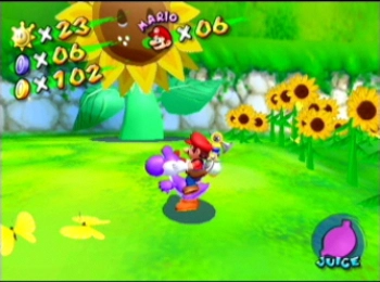 Mario se encontrará con muchos de sus viejos amigos durante la aventura de Super Mario Sunshine, y, ¡maravilla de las maravillas! incluso se subirá a Yoshi para dar una vuelta por la isla derrotando enemigos. Demostrará una gran variedad de movimientos nuevos, incluyendo un impresionante salto giratorio y un mejor deslizamiento sobre el estómago que aprovecha las capas de barro que cubren el paisaje.
